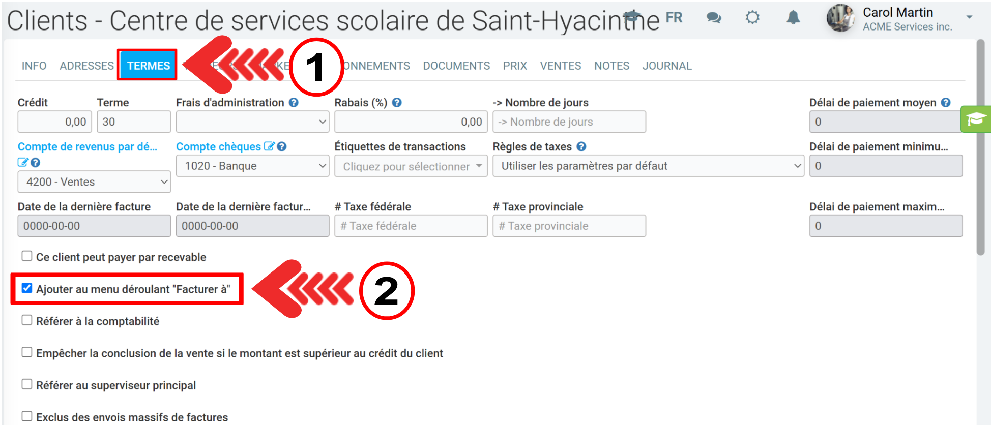 Pour ce faire, dans l'onglet Termes, vous devez d'abord spécifier que le Centre de services scolaire de Saint-Hyacinthe peux Ajouter au menu déroulant "Facturer à".