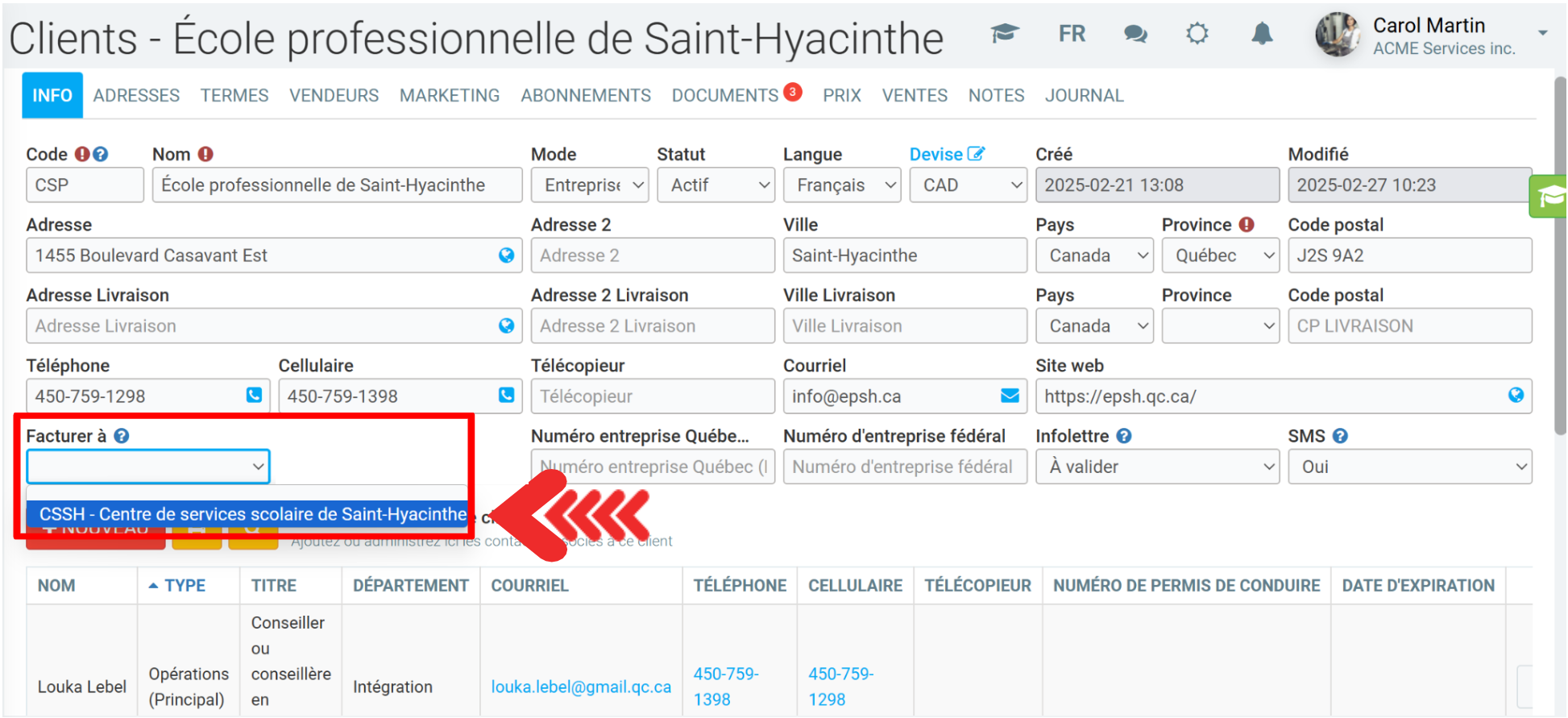 Ensuite, le Centre de services scolaire de Saint-Hyacinthe sera accessible dans le menu Facturé à de l'École professionnelle de Saint-Hyacinthe.
