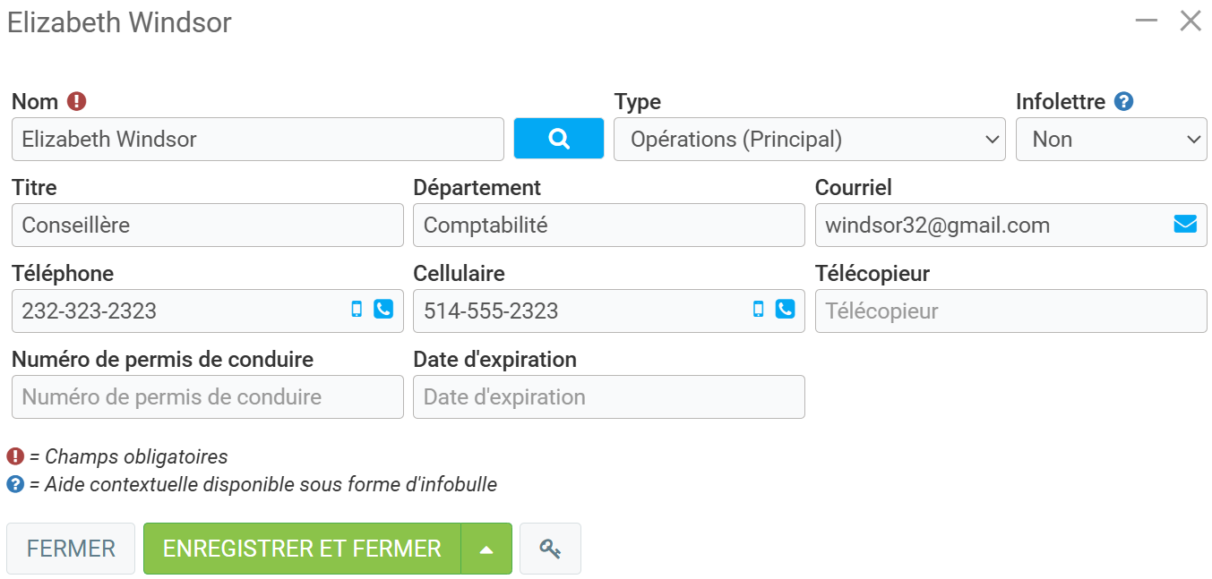Dans la section suivante, dans l'onglet Info, vous ajoutez les Contacts associés à ce client. Cela vous permet de spécifier le nom de vos interlocuteurs dans cette société : par exemple le service d’achat, le service de comptabilité, et autres. Les types Opérations principales, Comptabilité principale et communications recevrons certaines informations. Par exemple, les contacts de type Comptabilité principal recevront les factures et les états de compte générés par GEM-BOOKS.