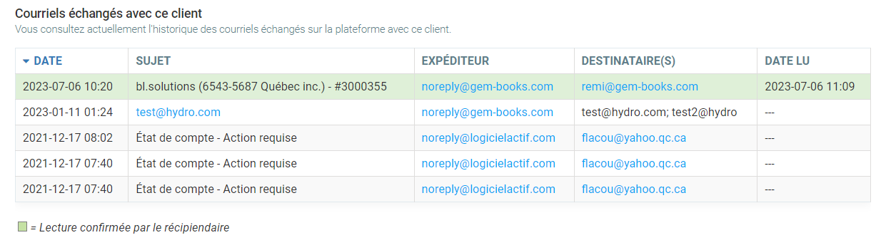 Ensuite, les courriels ayant transités par nos serveurs seront affichés dans les fiches de vos clients.