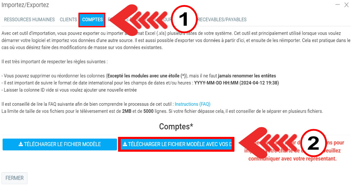 Cliquez sur l'onglet Comptes et ensuite sur le bouton bleu Télécharger le fichier modèle avec vos données.