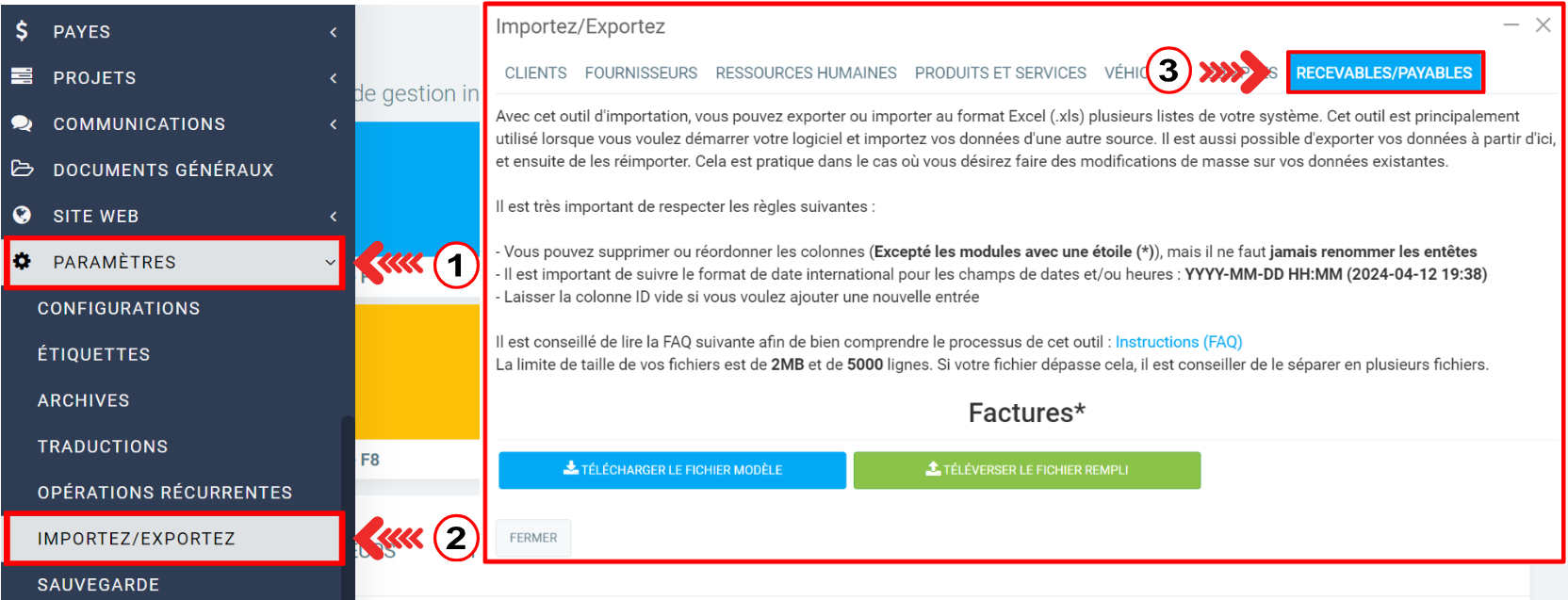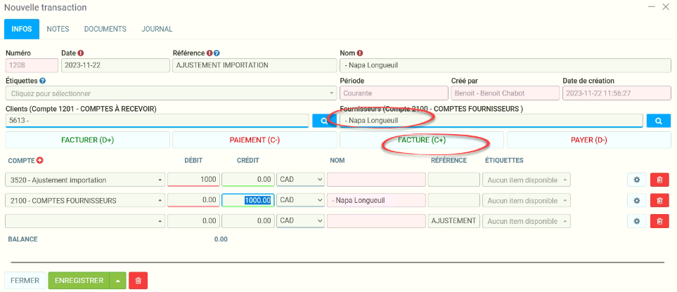 - Dans le champ Nom: mettre l’ancien numéro de facture si on entre les factures une par une.