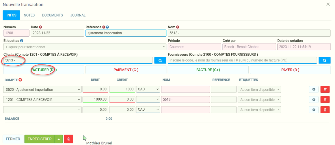 - Dans la transaction utilisez la contrepartie 3520 au DÉBIT, et le montant en recevable au Crédit.