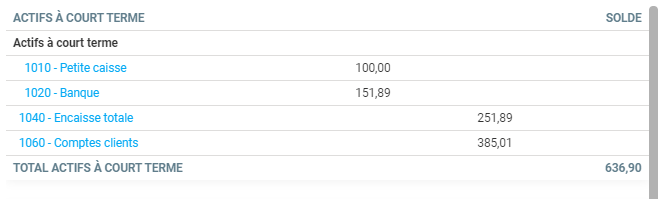 Le compte 1040 est plutôt un compte « Total de sous-groupe », il indique la somme des comptes de sous-groupes au-dessus de lui et affiche le total. Ce type de compte n’est pas utilisable dans une transaction.