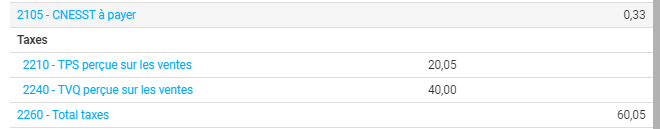 Le mot Taxes en gras est un compte de type En-tête du groupe. Ce type de compte n’est pas utilisable dans une transaction. Les comptes 2210 et 2240 sont des Comptes de groupes, soit des comptes normaux, mais puisqu’ils sont précédés d’un compte de type En-tête de groupe, ils sont placés en retrait. Enfin, le compte 2260 est un compte de type Total de groupe, il affiche le total du groupe. Ce type de compte n’est pas utilisable dans une transaction.