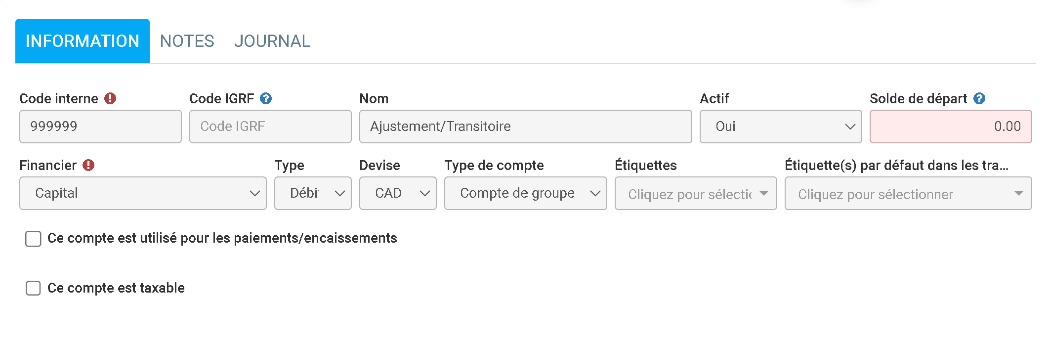 Vous remarquerez un dernier compte, codifié 999999, soit d'ajustement ou transitoire. C'est votre choix d'avoir un tel compte, mais je vous suggère d'avoir un compte dont la fonction n'est pas bien définie. Lorsque vous serez devant une transaction dont vous ne savez pas quel compte affecter, utilisez temporairement ce compte, le temps de demander à votre comptable ce que vous auriez dû faire. Un compte d'ajustement sert aussi comme compte temporaire lors de l'importation initiale. Nous suggérons d'utiliser le compte de "Ajustements" que nous codons avec les lettres AJ lors de l'importation.