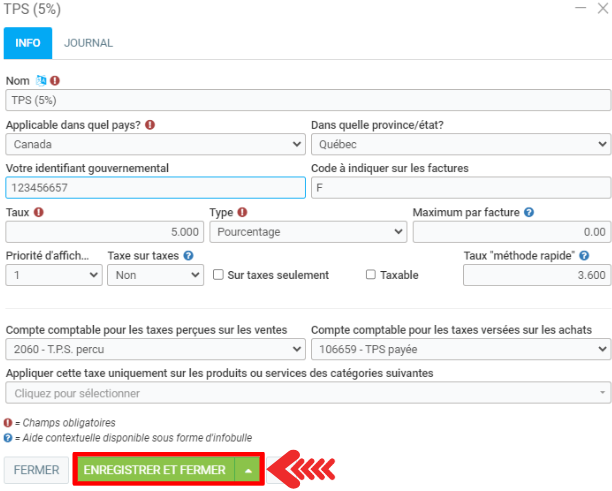 Il est important d'insérer vos numéros dans chaque province, car si vous facturez un client dans une province où le numéro de taxe n'y est pas inscrit, celui-ci n'apparaîtra pas sur la facture.