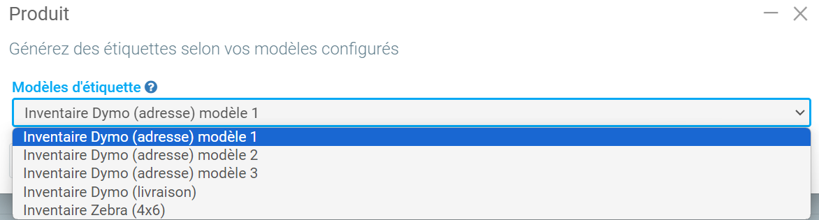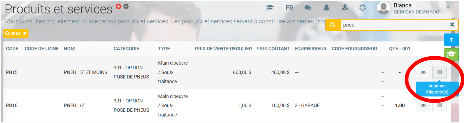 Dans le menu Inventaire > Produits et services, il est possible d'imprimer des étiquettes pour celui-ci à l'aide du bouton suivant au bas de la fenêtre.