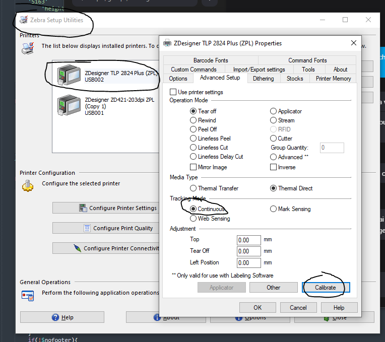 - Zebra TLP2824+ (doit être configuré en mode continue dans les paramètres de l'imprimante)