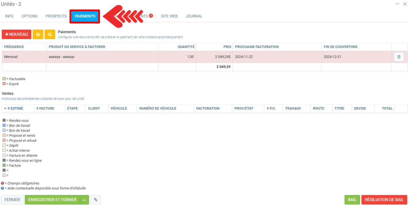Dans l’onglet Paiements, on peut rapidement créer une récurrence sur le système afin que l’argent du loyer soit prélevé automatiquement du compte du locataire, ou bien de la carte de crédit.