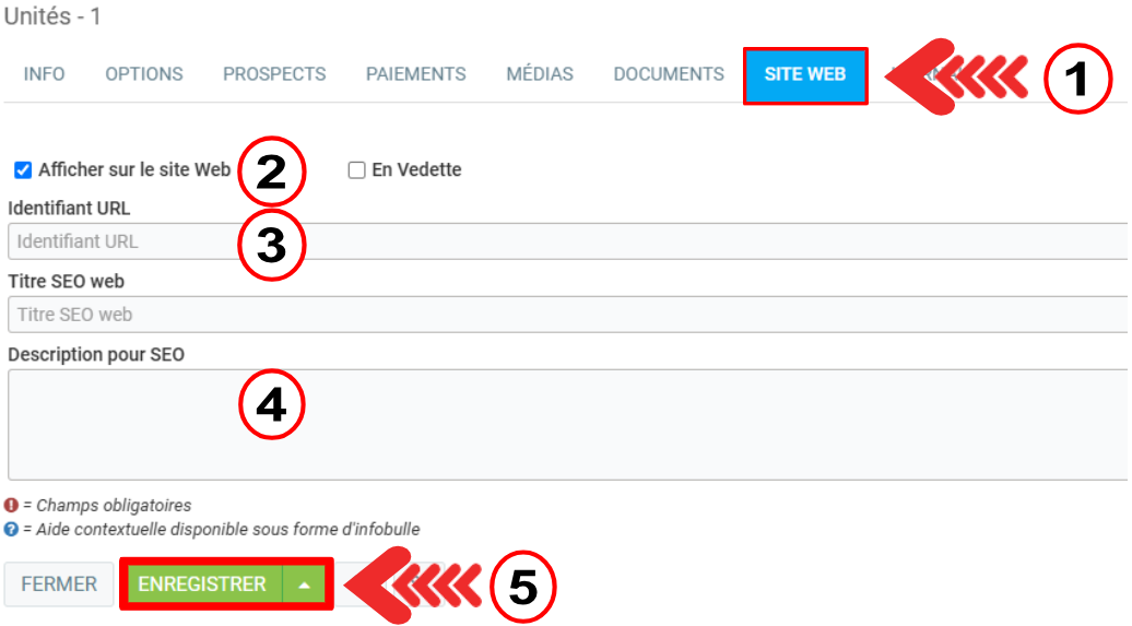 Dans le but de faire afficher des unités sur votre site web, assurez-vous de les activer dans l’onglet Site Web des unités.