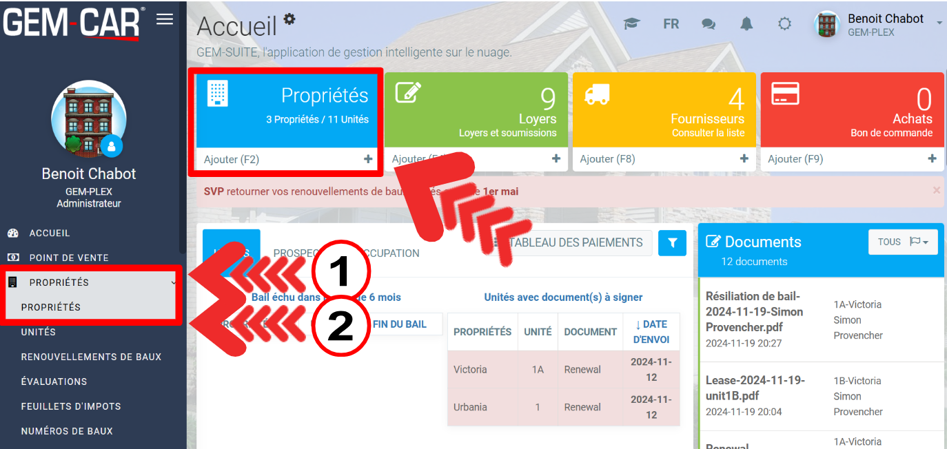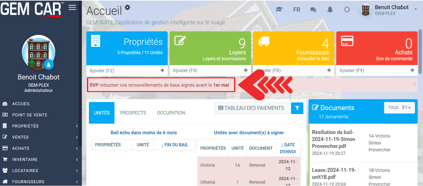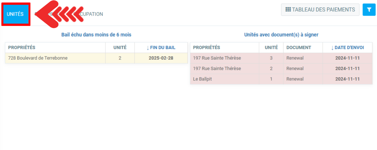 - Premier onglet (Unités): Cet onglet démontre les unités qui ont un bail échu bientôt, donc du pour renouvellement. À droite, on peut aussi voir les unités qui ont des documents en attente de signature.