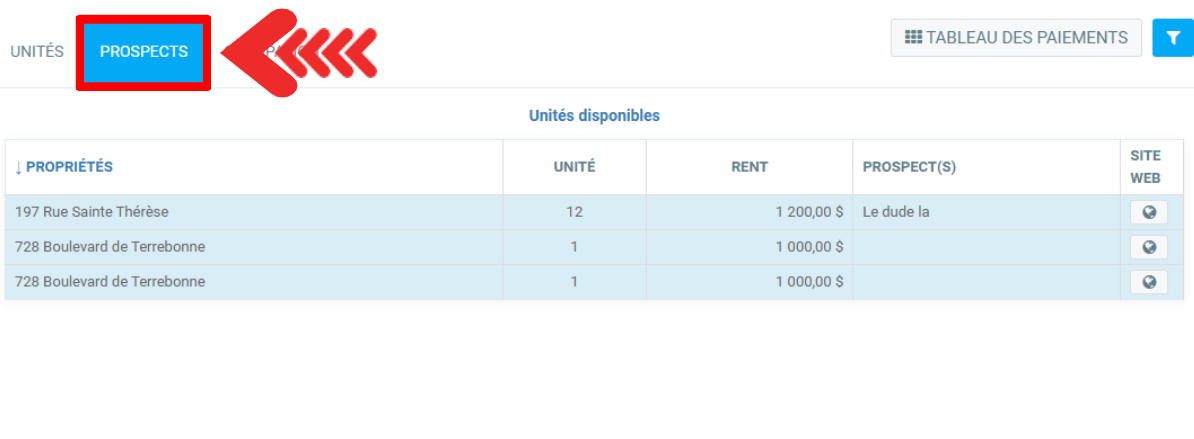 - Deuxième onglet (Prospects): Cet onglet démontre les unités qui n’ont pas de locataire présentement, avec les prospects sur la fiche de ceux-ci. À la droite, un raccourci vers la page sur le site web est accessible.