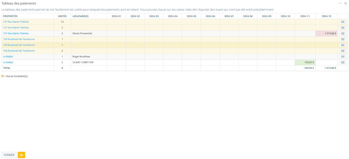 - Tableau des paiements: Le tableau des paiements est très utile pour avoir une vue d’ensemble des unités avec les montants qui ne sont pas encore payés, ainsi que ceux à venir. Cette interface permet aussi d’ajouter des loyers des mois précédents si des oublis ont été présents.