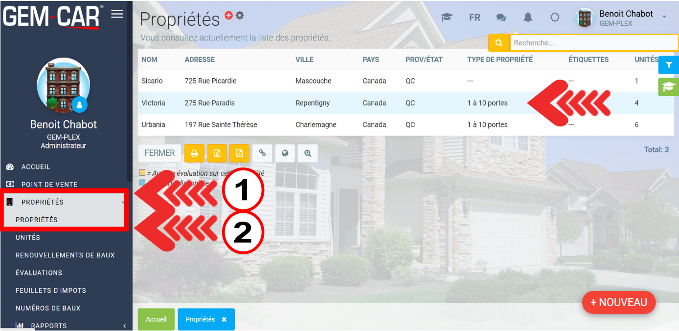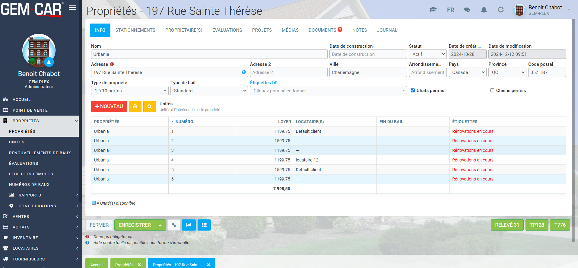 Lorsque l’on clique sur une propriété, nous allons avoir accès à plusieurs onglets concernant celle-ci, en commençant par les informations générales (adresses, nom, etc.) ainsi que les unités qu’elle contient.