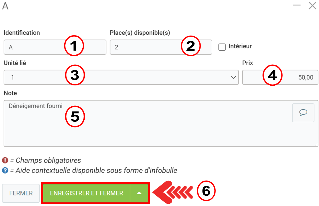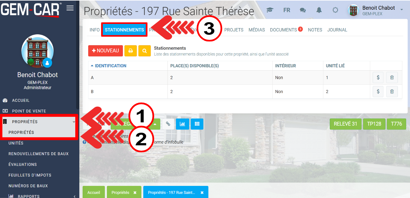 Dans l’onglet Stationnement, on peut gérer les stationnements de la propriété.