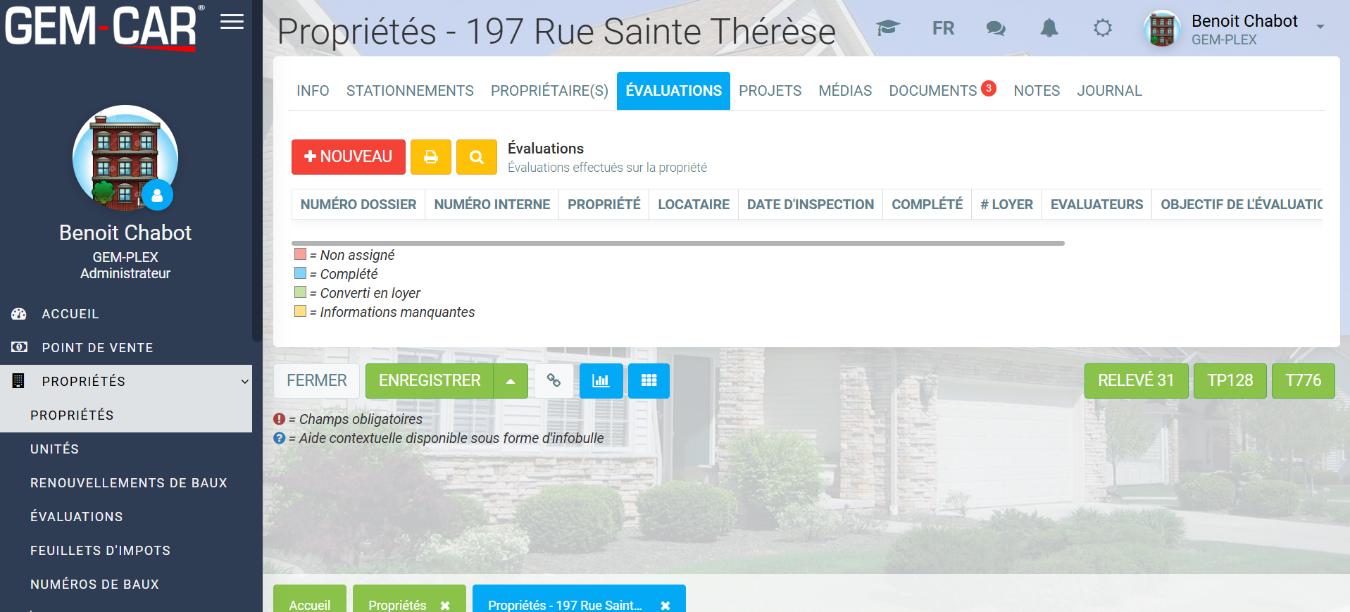 L’onglet Évaluations permet d’ajouter des évaluations sur la propriété.