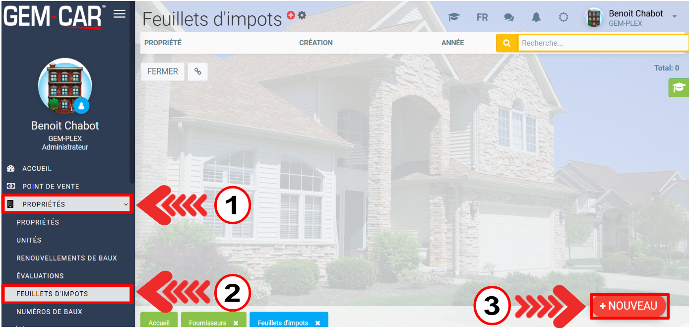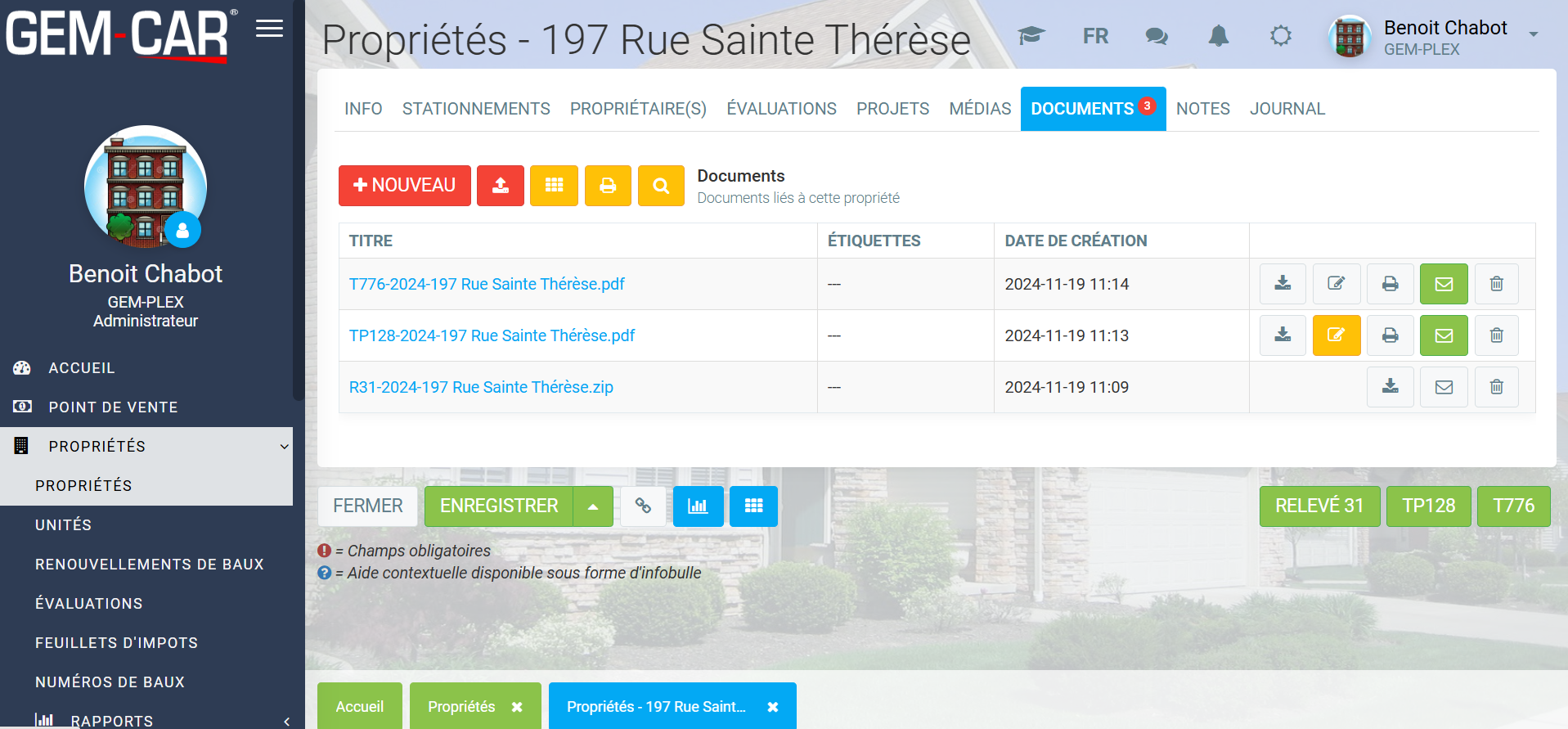 Le menu Propriétés > Feuillets d’impôts > +Nouveau permet à l’administrateur de générer les documents nécessaires à la fin d’année, dont le Relevé T776.