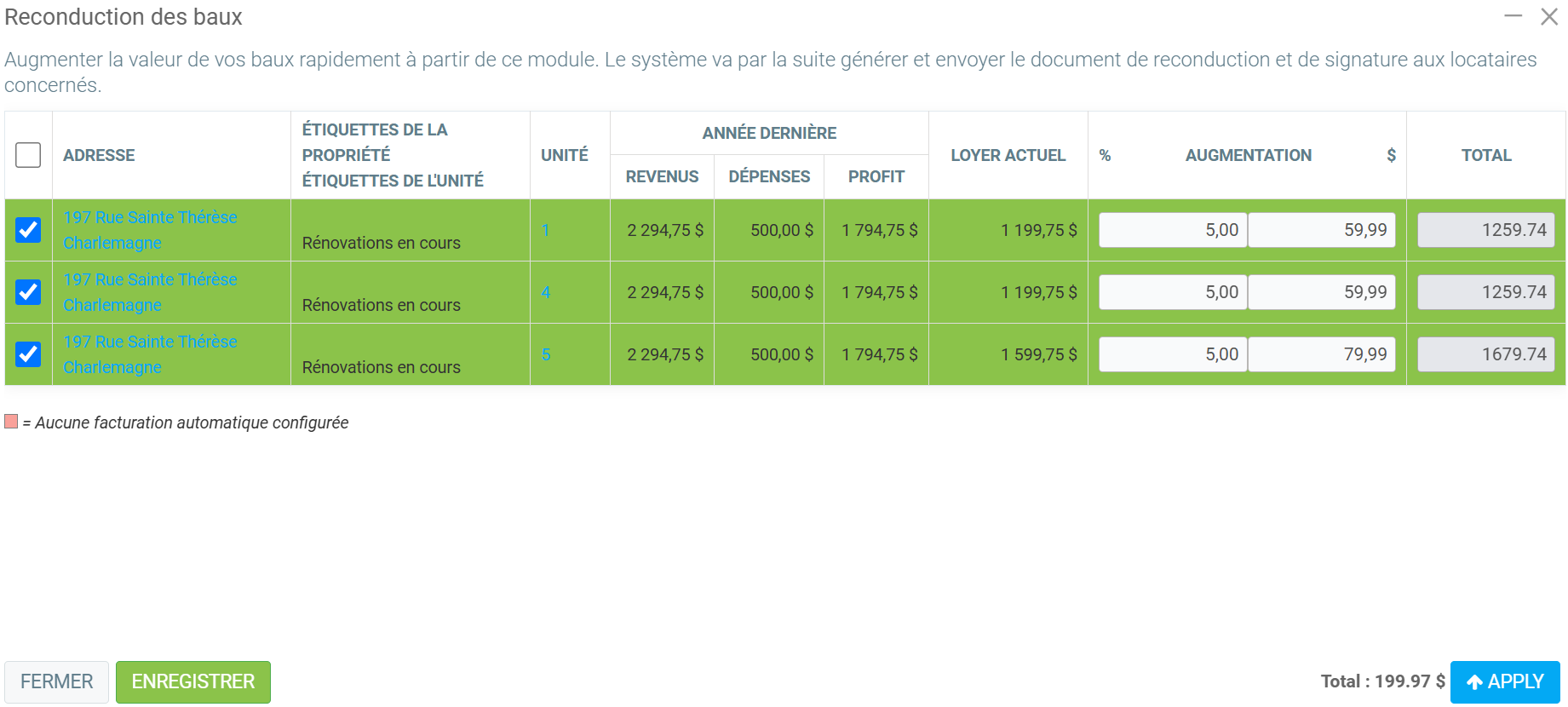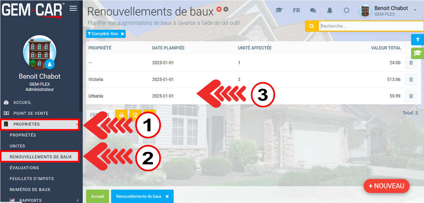 Dans le menu Propriétés > Renouvellement de baux, vous pouvez préparer les renouvellements ainsi que consulter l’historique de ceux-ci.