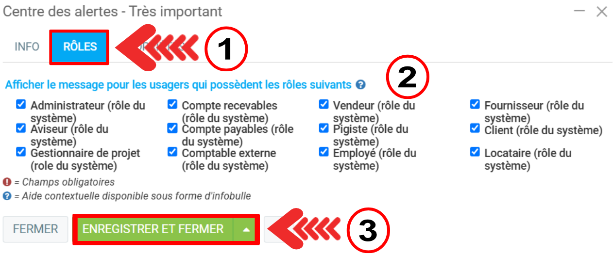 Dans l'onglet Centre des alertes > Rôles, vous avez les informations suivantes: "Afficher le message pour les usagers qui possèdent les rôles suivants".