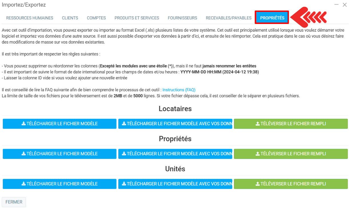 Importation de données: Une section pour importer/exporter les données de propriétés a été ajoutée.