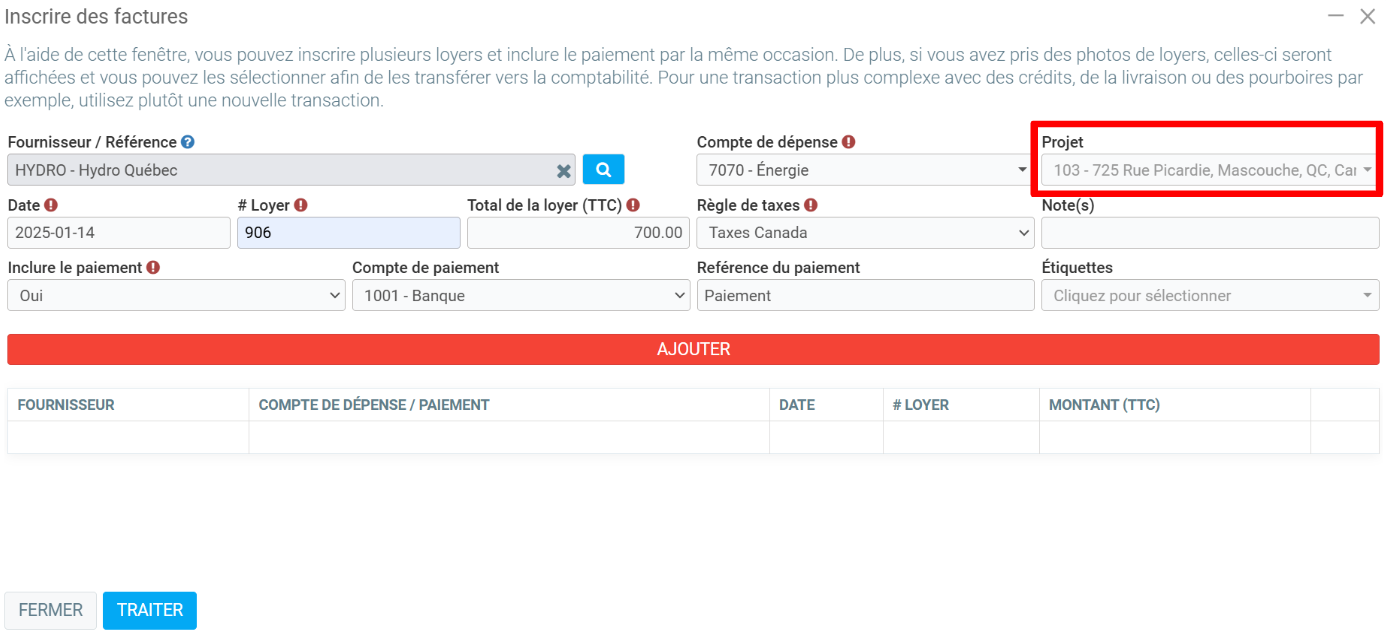 Inscription de facture avec projets: Dans l’interface d’inscription de factures, on peut maintenant lier un projet à la dépense directement la (disponible pour tous, pas seulement GEM-PLEX).
