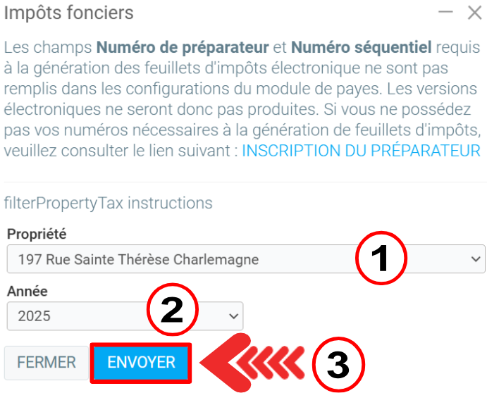 Similaire au système de feuillets d’impôts des paies, la liste offre l'historique précédemment généré, et on peut générer un nouveau ZIP pour l’ensemble des propriétés.