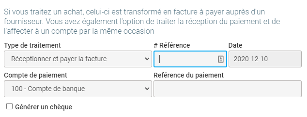 Dans cette fenêtre, vous pouvez choisir si vous souhaiter seulement créer la facture sans paiement (Réceptionner la facture), ou créer la facture au même moment que le paiement (Réceptionner et payer la facture). Si vous choisissez la première option, vous n'avez qu'à choisir la date et la référence de la facture du fournisseur, et celle-ci sera envoyée à la comptabilité, dans les payables. Si vous choisissez la seconde option, il vous faut aussi choisir le compte pour le paiement et la référence du paiement, et les deux seront inscrites dans la comptabilité, donc la facture ne sera pas à payé.