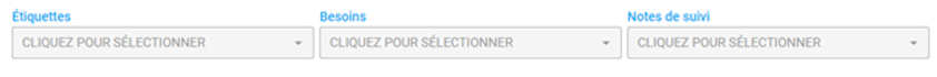 La ligne suivante comporte des champs pour mieux connaître le client. Le champ "Étiquettes" donne une liste déroulante de 3 choix : « Bon client », « Nouveau client », « Volume 3 ». Vous pouvez remplir ce champ selon l’évolution du client chez vous. Le champ "Besoins" vous donne la possibilité de mettre la valeur ajoutée dont le client a besoin pour rester fidèle à vos services. Le champ "Notes de suivi" indique l’action à entreprendre pour un meilleur suivi.