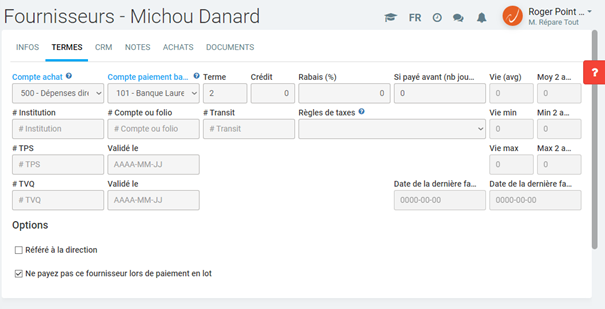 Cette fenêtre contient les termes de paiement convenus avec le Fournisseur, ainsi que les différentes taxes appliquées. Certains champs sont déjà configurés dans les paramètres du système.