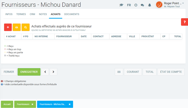 Bien que vous pouvez créer un nouvel achat avec le menu du même nom, il est aussi possible d'en créer un directement par ici. L'avantage est que cet achat sera automatiquement relié à ce fournisseur.