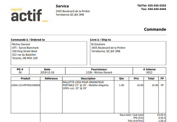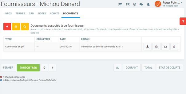 Dans cet onglet sera affiché tous les documents se rapportant au Fournisseur. Cela peut être un bon de commande, comme le cas ci-après, auprès de Michou Danard. C'est une commande qui a été générée. Vous pouvez aussi y joindre des documents téléversés à partir de votre ordinateur comme un contrat signé avec ce dernier, une autorisation de crédit ou tout autres documents pertinents.