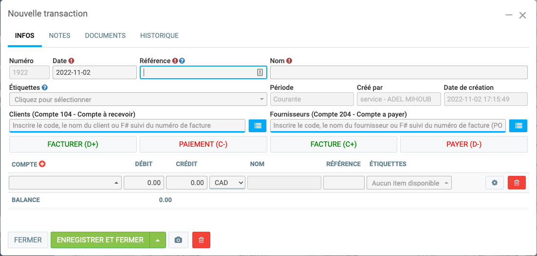 Il est plus simple de payer un fournisseur par le menu Fournisseurs, Appliquer des paiements, mais vous pouvez aussi le faire en passant par une transaction. Sous le menu Comptabilité, vous pouvez accéder à la liste des transactions par le menu Transactions et cliquer sur le bouton Nouveau en rouge pour en ajouter une nouvelle.