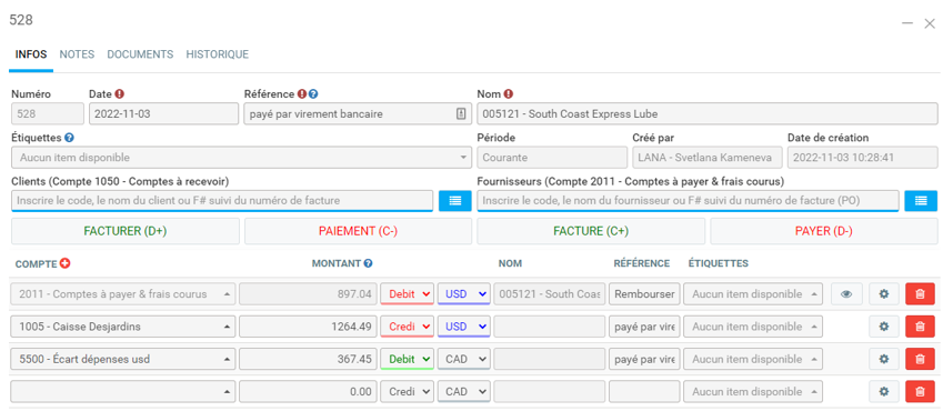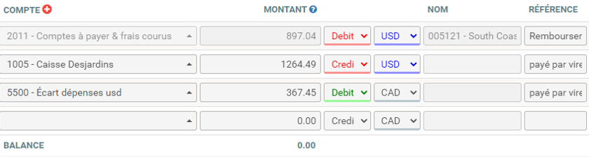 Paiement en US avec compte canadien et écart au Grand Livre