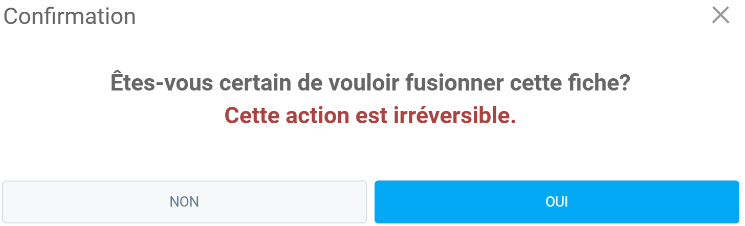 Après avoir cliqué sur Envoyer, une fenêtre de confirmation s'ouvre avec le message suivant: "Êtes-vous certain de vouloir fusionner cette fiche? Cette action est irréversible". Cliquez sur Oui.