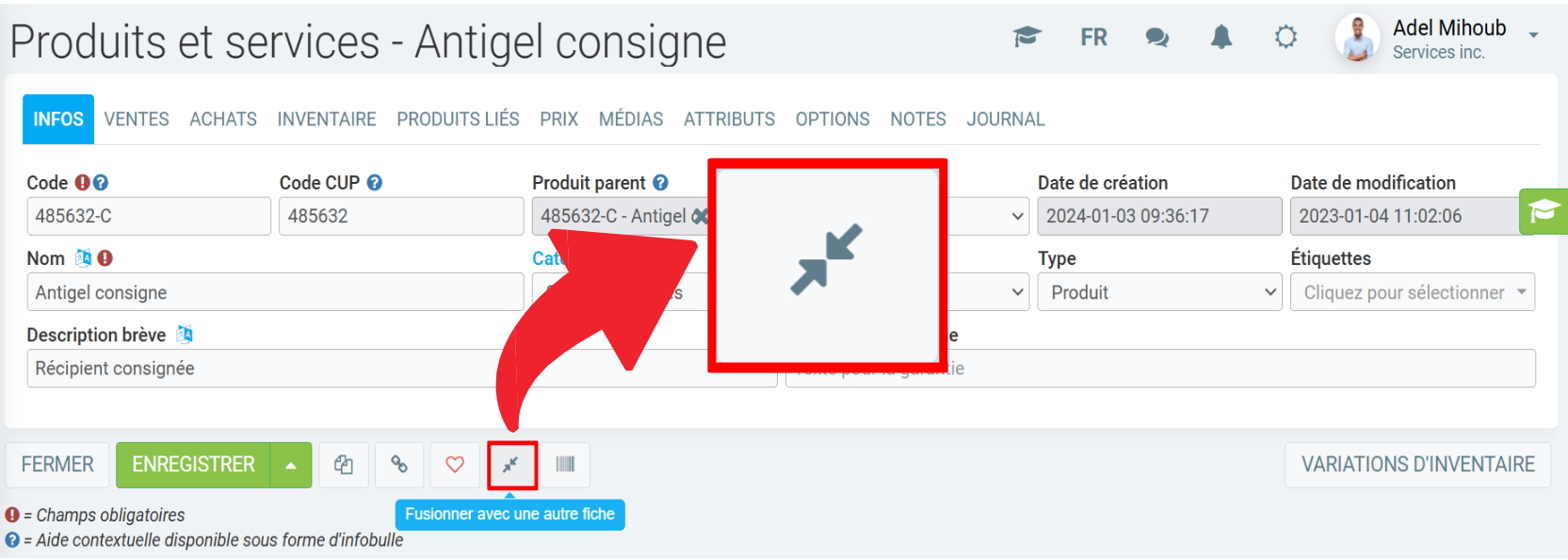 La fusion de produits et services permet de retirer les doublons de votre système. Par exemple, si vous avez créé un produit une deuxième fois par erreur, vous pouvez utiliser cette fonction afin de fusionner les deux éléments.