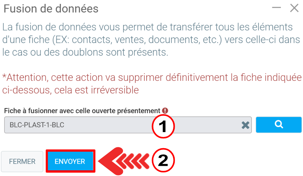 Dans la fenêtre suivante, inscrivez ou recherchez avec le bouton bleu afin de sélectionner la fiche que vous voulez fusionner sur la fiche actuelle. Il est très important de noter que cette action est irréversible, donc il vous faut être certain de ce que vous faites.