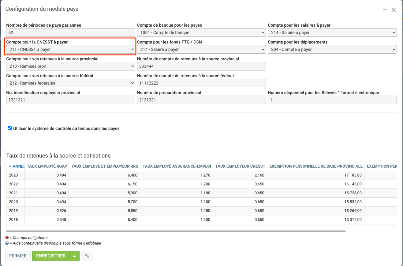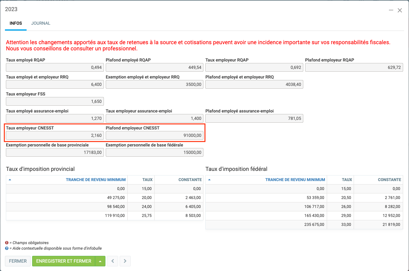 Dans le même écran plus bas, assurez-vous que pour chaque année, vous avez un Taux employeur CNESST (ex. 2,16) et un Plafond employeur CNESST (ex. 91 000).