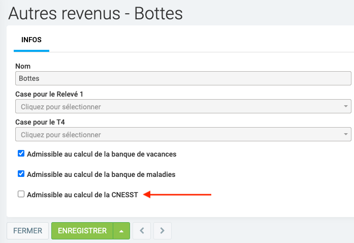 Si vous spécifiez des déductions dans "Autres revenus", vous pouvez dire s’ils sont admissibles au calcul de la CNESST.