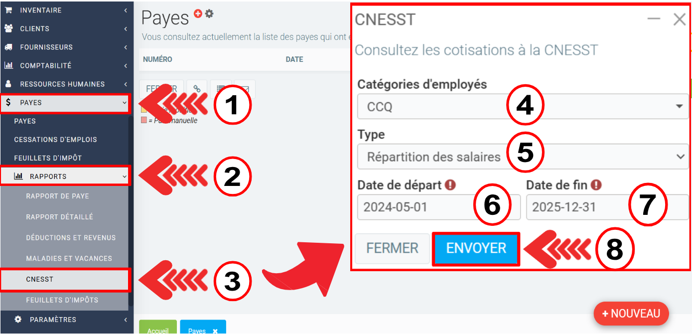 Vous pouvez consulter le rapport mensuel en tout temps à l'aide du menu Payes > Rapports > CNESST.
