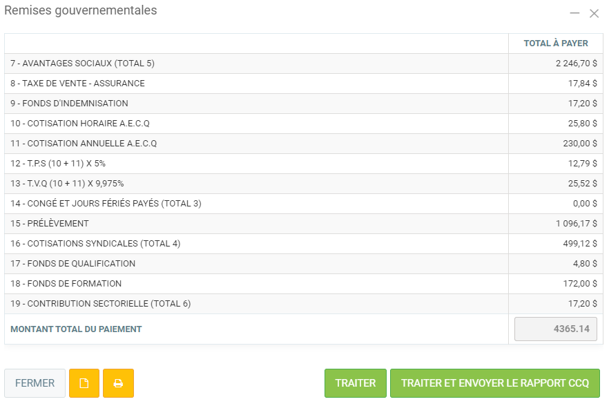 Vous constaterez un bouton Traiter et envoyer le rapport CCQ dans le bas du rapport. Ce bouton va, en plus de faire la transaction de paiement dans le module de comptabilité, envoyer de façon électronique le rapport CCQ. Veuillez noter qu'il est nécessaire d'avoir rempli votre numéro d'identification aux services en lignes dans les paramètres afin que ce bouton soit visible. Si ce n'est pas le cas, un message d'avertissement vous sera affichée.