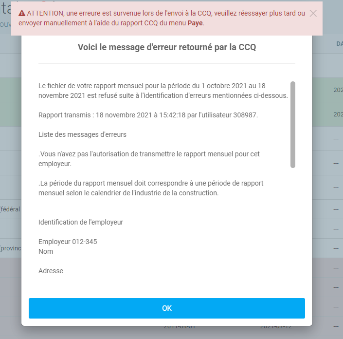 Lorsque vous cliquerez sur ce bouton, l'envoi à la CCQ sera fait. Si une erreur survient, le message vous sera affichée de cette façon: