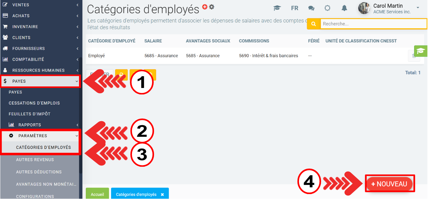 Avant de pouvoir effectuer des payes CCQ, il faut avoir des ressources humaines ayant au minimum une catégorie d'employé lié à la CCQ. Pour créer de nouvelles catégories d'employés, rendez-vous dans le menu Payes > Paramètres > Catégories d'employés > +Nouveau.