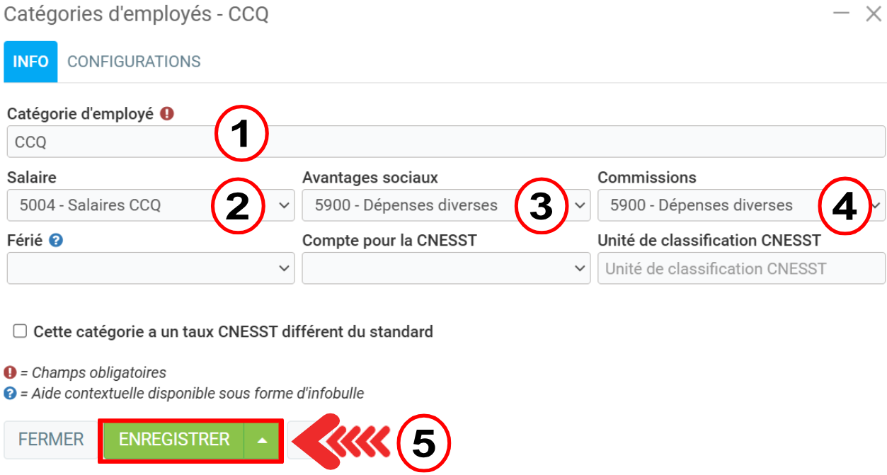 Catégorie d'employé: Indiquer le nom de la catégorie. Celui-ci sera utilisé afin de l'associer à une ressource humaine, et sera visible au moment de la paie. Truc: Utilisez le nom du métier que vous sélectionnerez dans l'onglet CCQ.