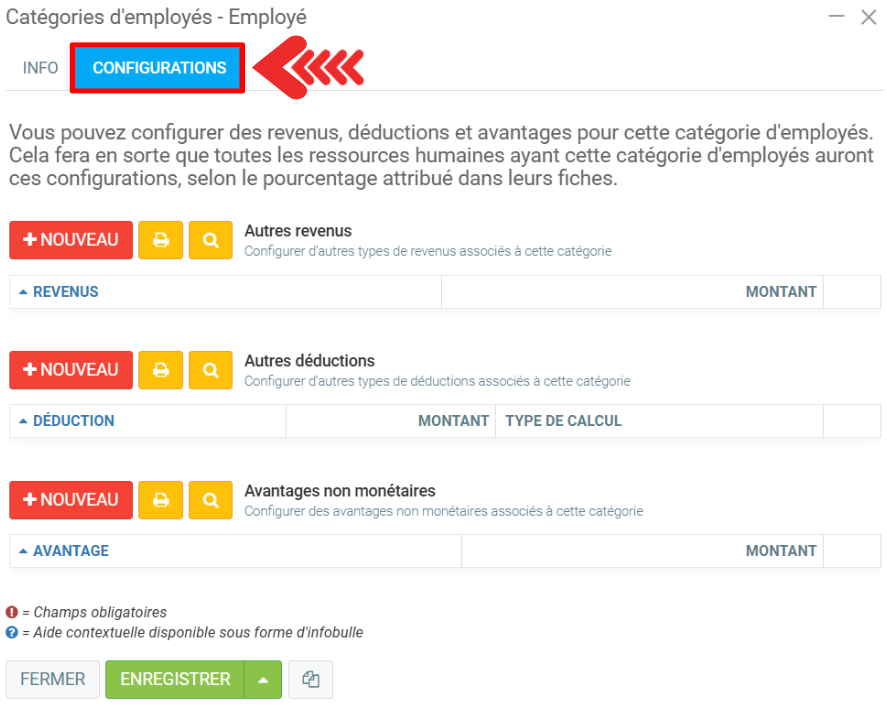 Ensuite, rendez-vous dans l'onglet Configurations et vous pouvez cliquer sur +Nouveau et insérer Autres revenus, Autres déductions et Avantages non monétaires.