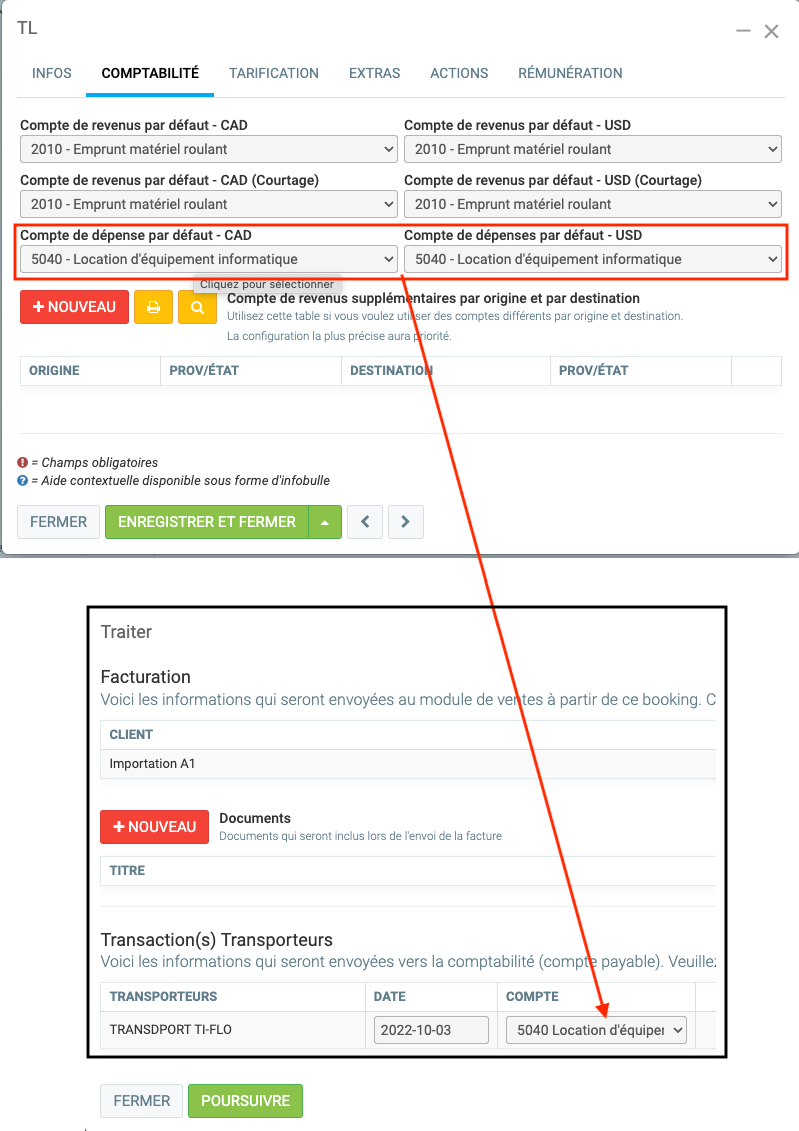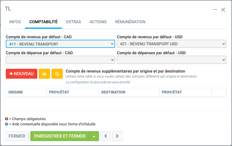 Dans l'onglet Comptabilité, vous pourrez déterminer les comptes comptables utilisés pour les transports de ce type, et vous avez la possibilité de définir ces comptes par régions si cela est nécessaire pour vous.