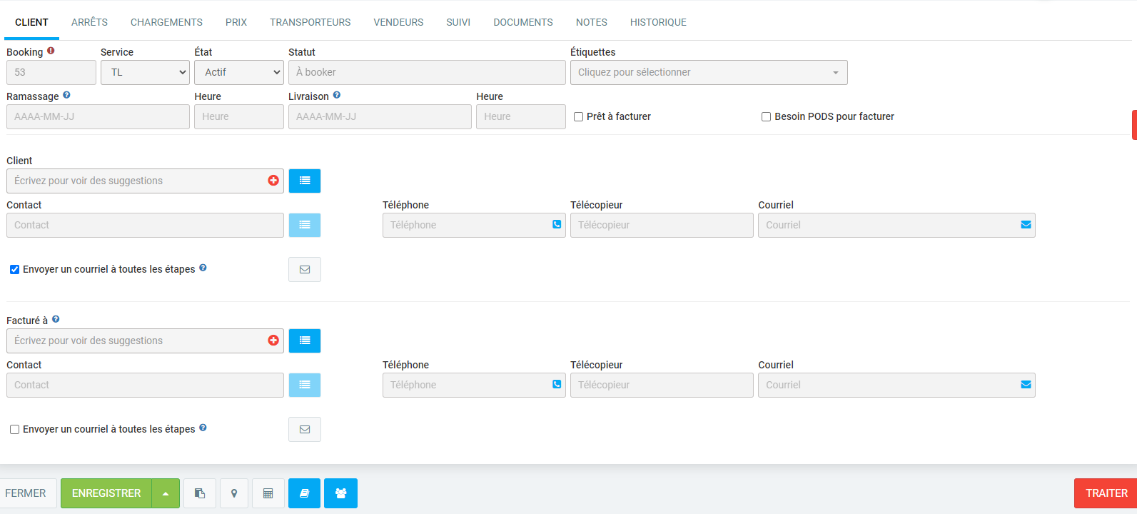 La section du haut sera présente dans tous les onglets du booking et contient les informations importantes de celui-ci. La plupart de ces champs sont des informations non modifiables qui proviennent d'autres onglets, mais qui sont pratique à voir en tout temps. C'est dans cette section que vous pouvez définir le type de transport de ce booking, comme vu dans la FAQ suivante : Comment ajouter ou éditer des services de transport ? Le premier onglet consiste à définir le client pour qui le transport sera effectué, de plus que le contact de celui-ci.