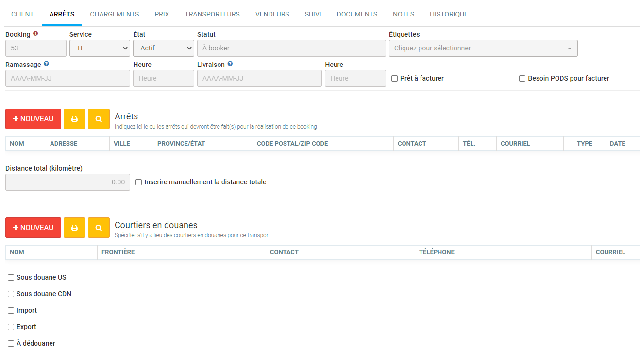 L'onglet Arrêts sera l'endroit ou vous définirez les étapes du transport. Dans la liste d'arrêts, vous pouvez cliquer sur le + afin d'ajouter un nouvel arrêt. Chaque arrêt a un type associé, soit Origine, Arrêt ou Destination. Pour qu'un booking soit valide, il faut qu'au minimum une origine et une destination soit configuré.