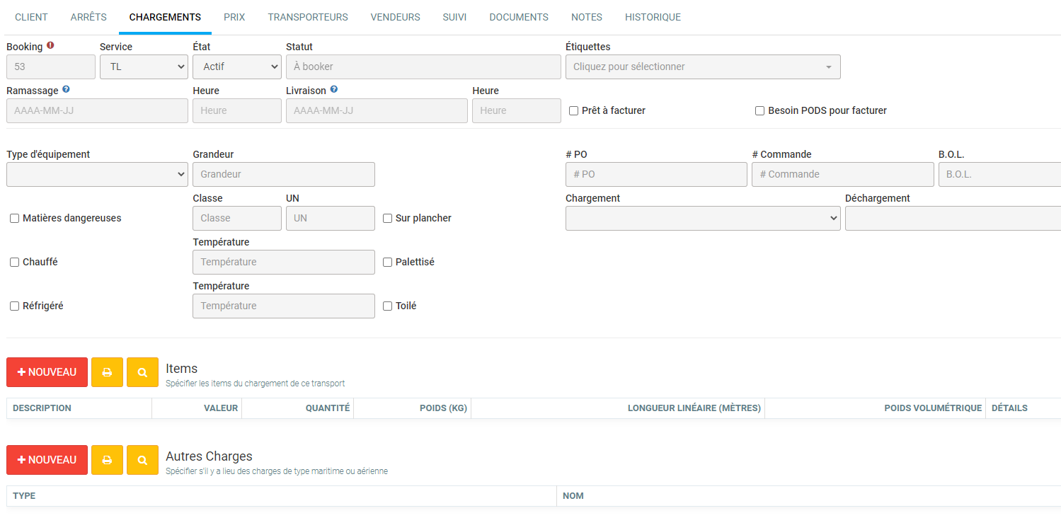 L'onglet Chargement sert à définir ce que le transport contient, et quel seront les équipements nécessaires afin de compléter le transport. Vous pouvez insérer plusieurs équipements ainsi que plusieurs items pour un même booking. Dans l'onglet "Arrêts", vous allez pouvoir limiter un arrêt à certains items ou équipements, permettant plusieurs transports sur un même booking.