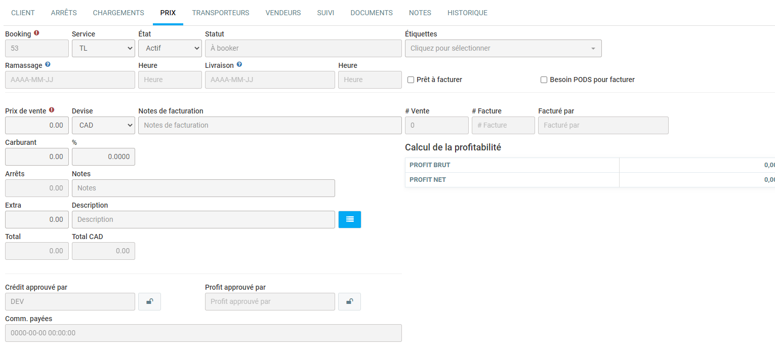 L'onglet Prix sert à définir le prix demandé au client pour le transport, de plus que les extras associées à celui-ci. Si le booking a précédemment été facturé, le lien vers la facture sera aussi affichée dans cet écran.